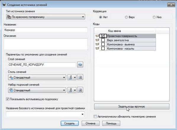 При создании источника «По красному поперечнику» необходимо указать коррекцию для этого источника и коды для создания сечений по красному поперечнику.