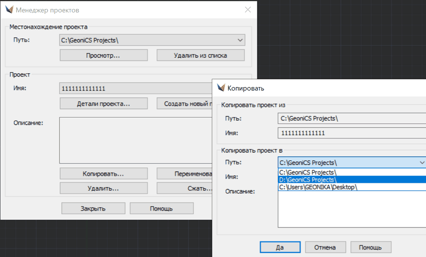 Затем после щелчка на кнопке Копировать нужно выбрать неактивный проект (Активный копировать нельзя!).