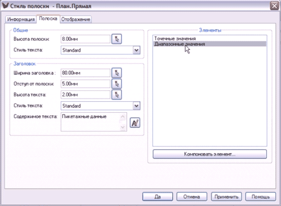 В свойствах окна профиля, на вкладке Полоски выбираем тип полоски Пикетажные данные. Устанавливаем динамический стиль
