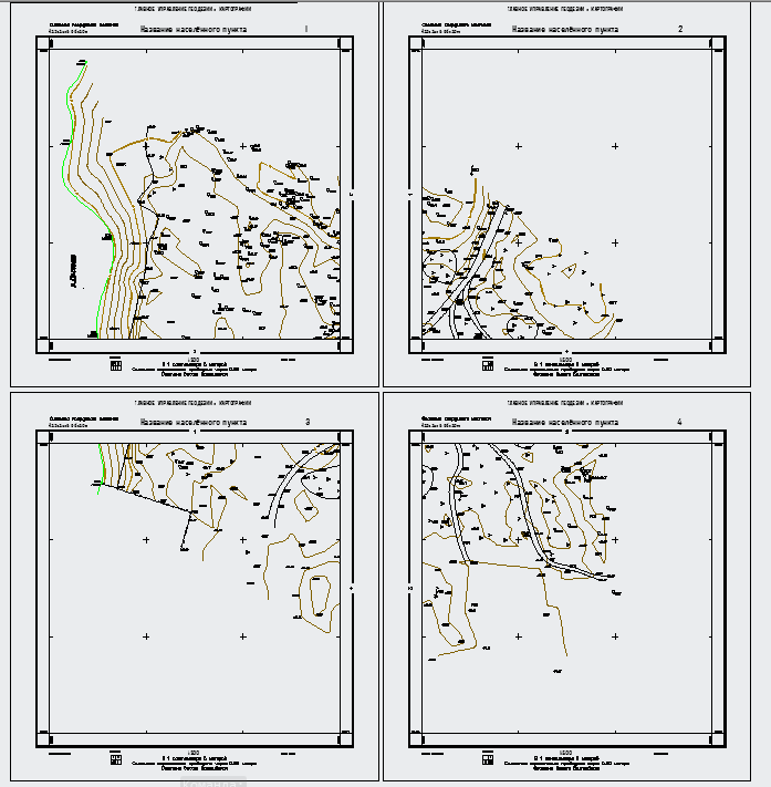 Надписи зарамочного оформления задают текст, который будет отображен в верхней и нижней частях планшета. В их число входят: ведомство, населенный пункт, система координат, название области или района, система высот, расстояние проведения сплошных горизонталей, организация (выполняющая проект), метод съемки территории.