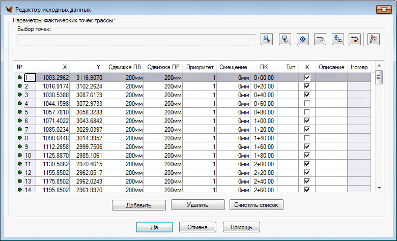 Здесь же можно редактировать все параметры точек. Кроме того, можно добавлять точку после текущей и удалять точки.